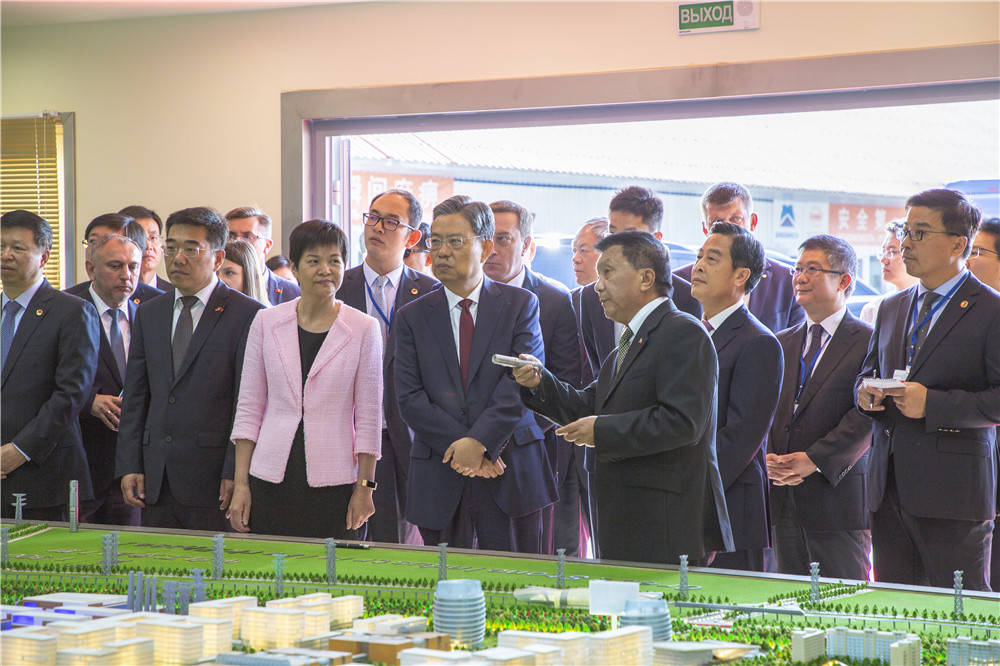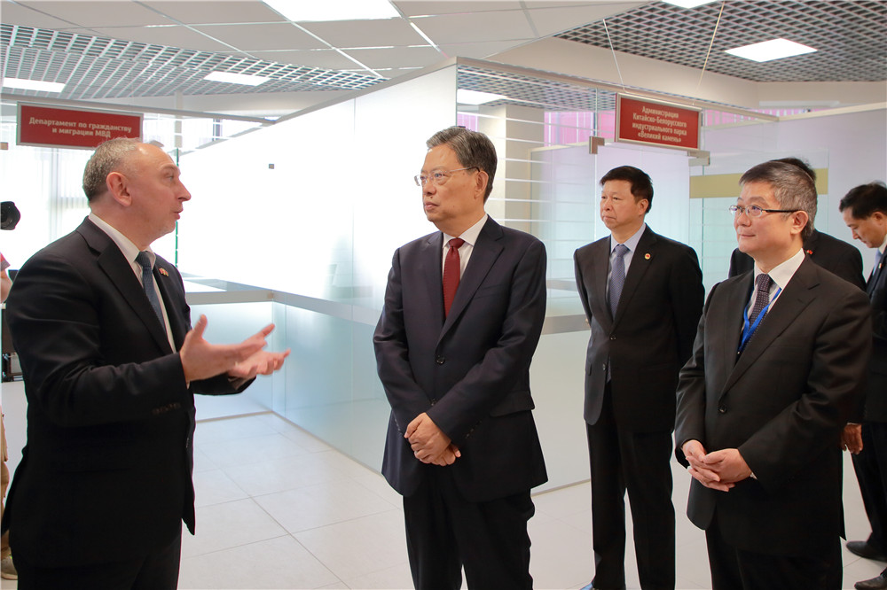 趙樂際書記首先來到園區(qū)規(guī)劃館,聽取了中白工業(yè)園區(qū)管委會主任亞羅申科和中白工業(yè)園區(qū)開發(fā)公司首席執(zhí)行官胡政關(guān)于園區(qū)規(guī)劃和開發(fā)運營情況的匯報,在園區(qū)“一站式”服務大廳聽取了園區(qū)管委會的介紹和演示,在招商局集團投資建設(shè)的中白商貿(mào)物流園展示交易中心聽取了商貿(mào)物流園規(guī)劃建設(shè)和運營回報的匯報,參觀了白俄羅斯首個公共保稅物流倉、剛剛設(shè)立的海關(guān)站及中國援建110KV變電站等項目。在中白工業(yè)園中國投資企業(yè)展示大廳逐一了解了中國入園企業(yè)情況。趙樂際指出,要認真落實習近平總書記重要指示,堅持正確義利觀,堅持共商共建共享,堅持綠色發(fā)展、高質(zhì)量發(fā)展,打造成為絲綢之路經(jīng)濟帶上的標志性項目。