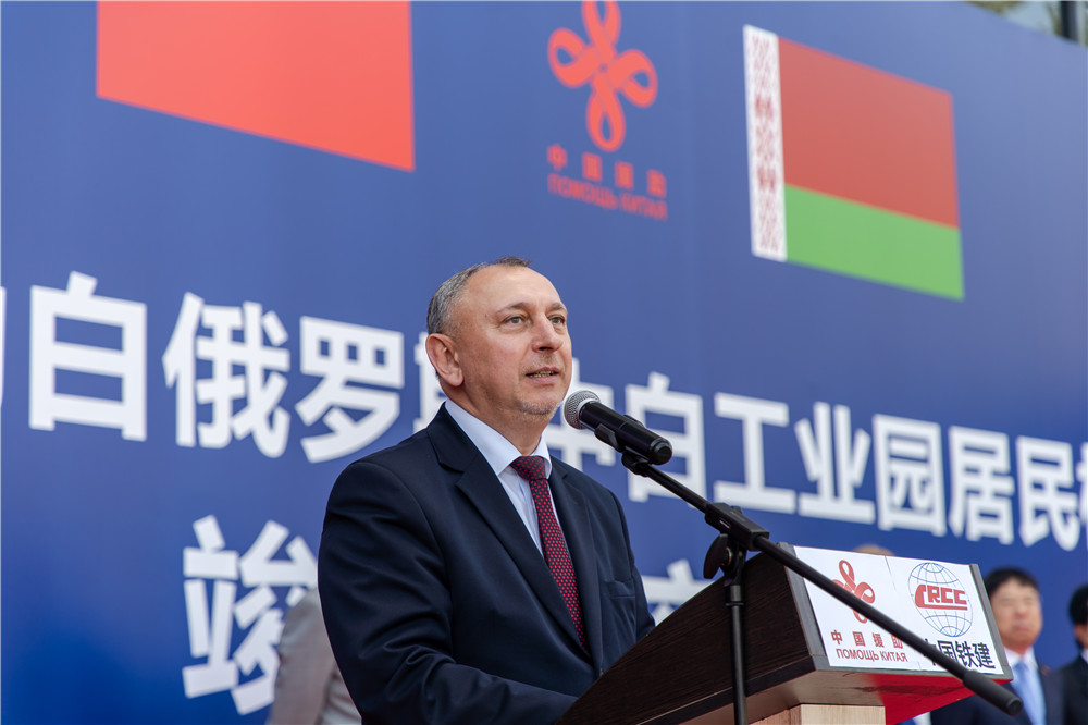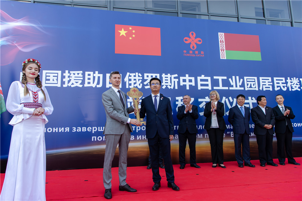 2019年8月27日上午,中國援助白俄羅斯中白工業(yè)園居民樓項目竣工移交儀式在居民樓前舉行,標志著園區(qū)第一個生活配套設施竣工并即將投入使用。白俄羅斯經濟部副部長葉列娜、中國駐白俄羅斯大使館經濟商務參贊處參贊楊修敏、中白工業(yè)園管委會主任亞羅申科、開發(fā)公司CEO胡政、斯莫列維奇區(qū)副區(qū)長尼古拉等領導出席了本次儀式。施工單位中鐵二十五局集團駐白俄羅斯首席代表田佳奇向業(yè)主單位園區(qū)開發(fā)公司第一副總經理卡羅杰耶夫交接了居民樓“金鑰匙”。
