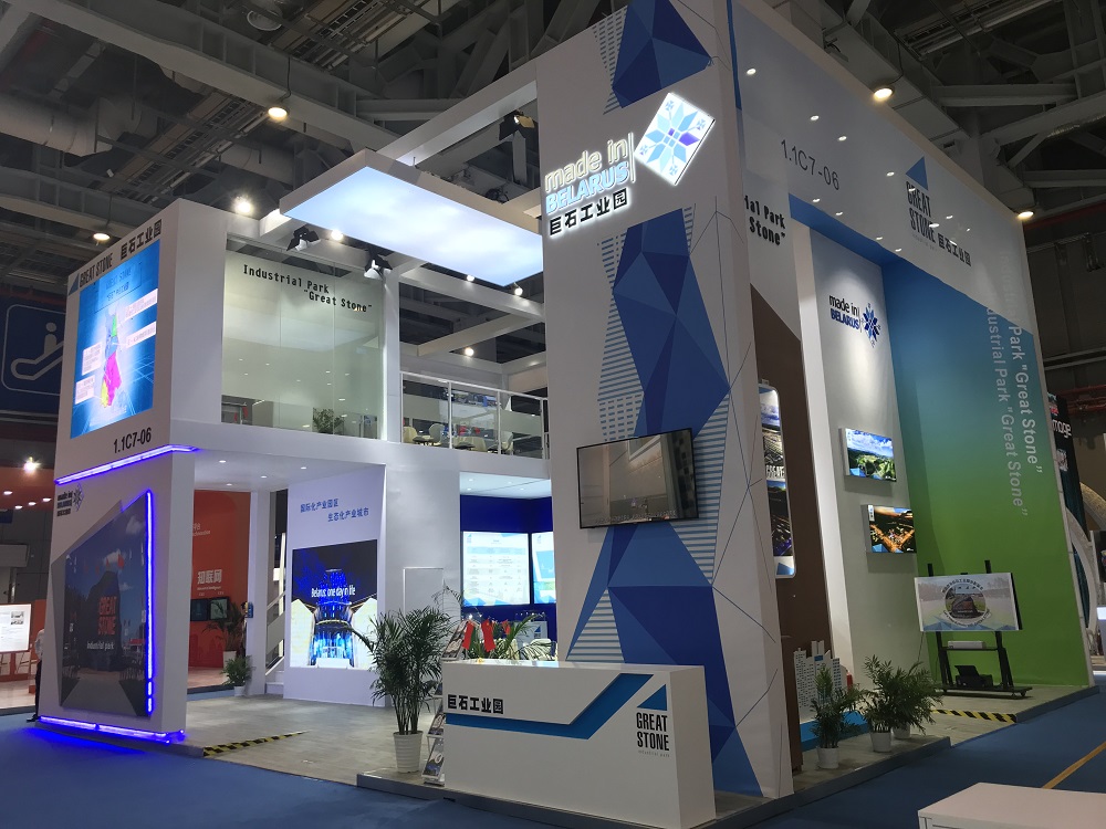 中白工業(yè)園已連續(xù)兩年參展進(jìn)口博覽會。本屆中白工業(yè)園展臺占地更大,總共120平米,采用雙層結(jié)構(gòu),總高8米,將空間向上延伸,制造出更多的休息和洽談區(qū)域。本方案多運用動態(tài)視頻和靜態(tài)畫面,動靜結(jié)合的方式展示工業(yè)園區(qū)的規(guī)劃、規(guī)模、投資環(huán)境及前景。造型上,展臺以簡潔的直線條,營造出大氣的視覺效果。色彩上,采用園區(qū)藍(lán)色三角形LOGO為基本元素,以藍(lán)白色為主色調(diào),視覺上通透明亮。此外,展臺設(shè)置拍照專區(qū),游客不用走出國門,即可與中白工業(yè)園的標(biāo)志性景點“巨石”合影,并在1分鐘內(nèi)獲得專屬定制照片。