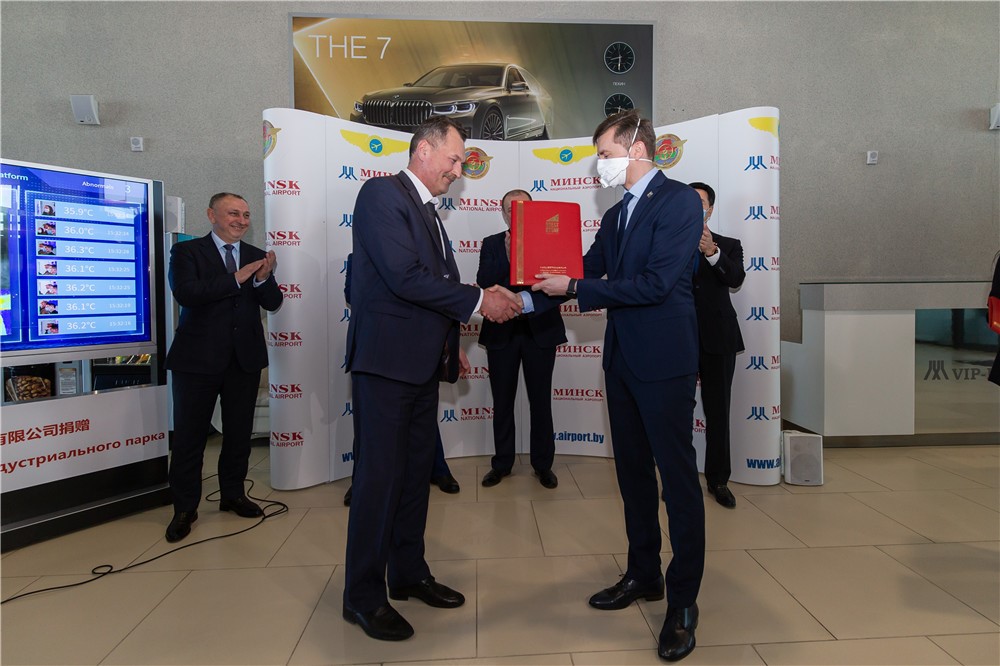 2020年4月22日下午,中白工業(yè)園區(qū)開發(fā)公司聯(lián)合園區(qū)居民企業(yè)中新智擎公司向白俄羅斯衛(wèi)生部無償捐贈(zèng)一臺(tái)智能測(cè)溫機(jī)器人及配套設(shè)備,該設(shè)備將第一時(shí)間在明斯克國(guó)際機(jī)場(chǎng)投入使用,協(xié)助機(jī)場(chǎng)做好新冠疫情的防控工作。白俄羅斯衛(wèi)生部副部長(zhǎng)安德羅休克、中國(guó)駐白俄羅斯大使館政務(wù)參贊羅占輝、中白工業(yè)園管委會(huì)主任雅羅申科、園區(qū)開發(fā)公司總經(jīng)理嚴(yán)剛、明斯克國(guó)際機(jī)場(chǎng)總經(jīng)理霍爾涅科等領(lǐng)導(dǎo)出席本次捐贈(zèng)儀式。