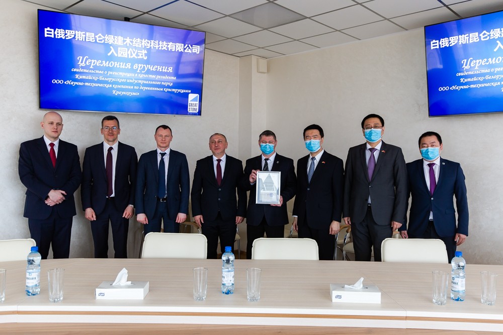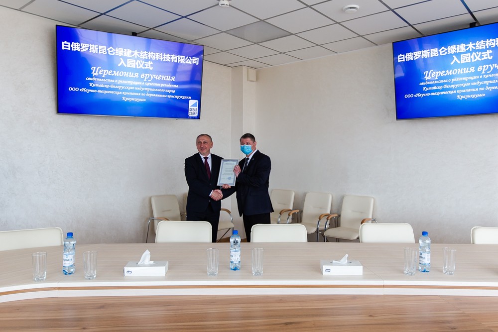 2020年5月12日下午,白俄羅斯昆侖綠建木結(jié)構(gòu)科技有限公司(以下簡稱“昆侖綠建”)成為中白工業(yè)園入園企業(yè),在園區(qū)開發(fā)公司總經(jīng)理嚴(yán)剛等領(lǐng)導(dǎo)的見證下,管委會主任亞羅申科向該公司代表頒發(fā)了入園證書。