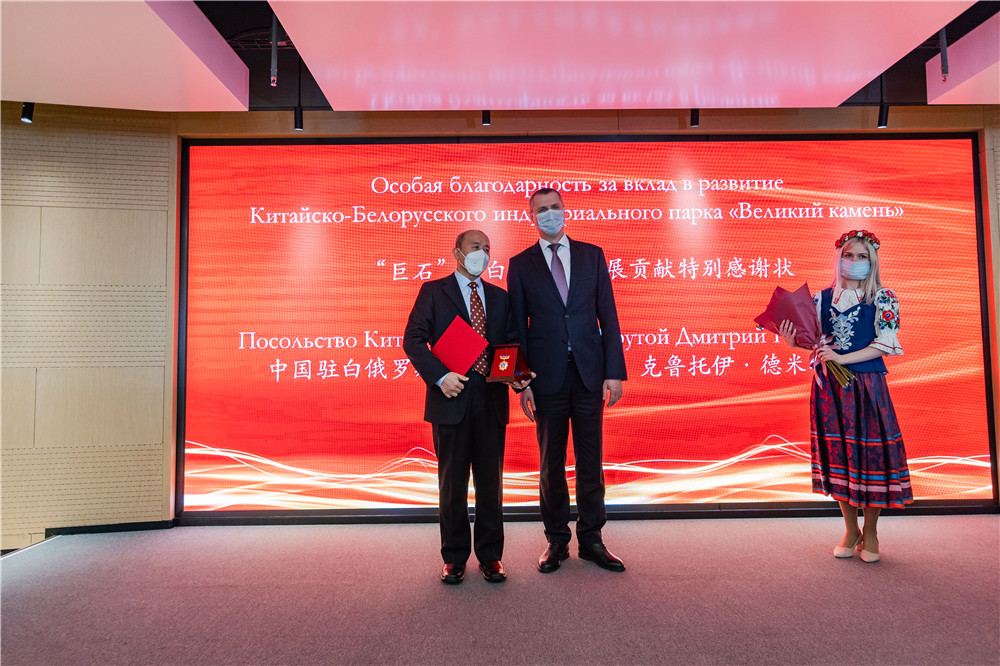 隨后,在中白工業(yè)園開發(fā)建設(shè)五周年頒獎儀式上,園區(qū)管委會和開發(fā)公司向為園區(qū)建設(shè)發(fā)展作出突出貢獻的政府單位、企業(yè)和個人頒發(fā)了獎?wù)潞妥C書。