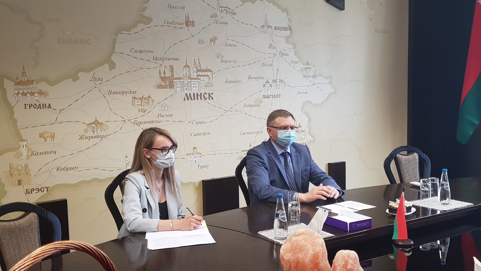 6月30日上午,中白工業(yè)園開發(fā)公司總經(jīng)理嚴(yán)剛帶隊拜會白俄羅斯經(jīng)濟部部長切爾維亞科夫,并代表開發(fā)公司祝賀白俄羅斯經(jīng)濟部成立100周年。