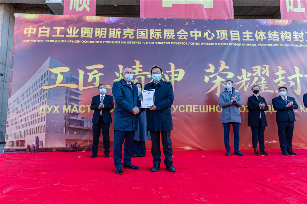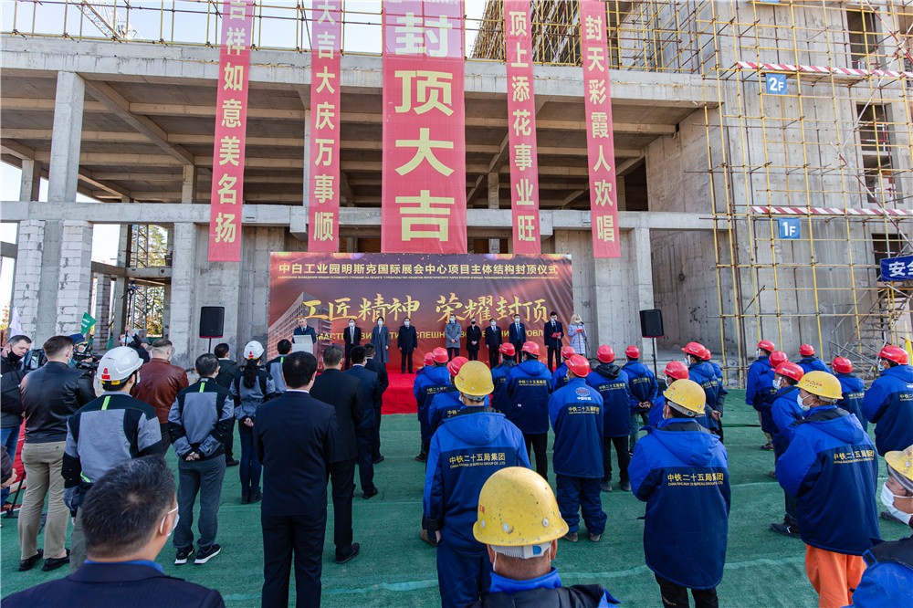 2021年國慶期間,由招商蛇口、成都興城聯(lián)合投資,中鐵二十五局集團有限公司承建的中白工業(yè)園明斯克國際展會中心項目順利封頂,中白工業(yè)園管委會主任亞羅申科,中白工業(yè)園開發(fā)公司第一副總經(jīng)理卡羅杰耶夫,招商興城國際展會中心有限公司總經(jīng)理陳偉、中鐵二十五局項目經(jīng)理戶曉飛等領(lǐng)導(dǎo)出席封頂儀式并致辭,亞羅申科主任宣布項目主體結(jié)構(gòu)封頂,并為投資方頒發(fā)園區(qū)特別貢獻獎,以表彰本項目優(yōu)異的施工進度、安全文明及質(zhì)量管理。