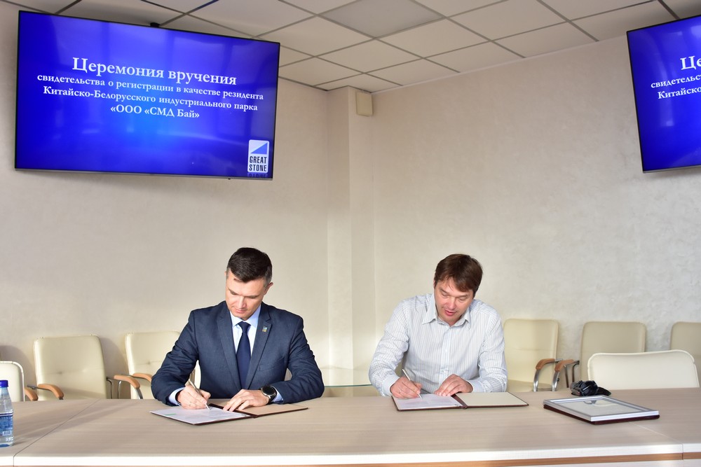 10 月 21 日,SMD BY有限責(zé)任公司注冊成為中白工業(yè)園第80家居民企業(yè),園區(qū)管委會主任亞羅申科向總經(jīng)理赫瓦利科·謝爾蓋頒發(fā)了入園證書。