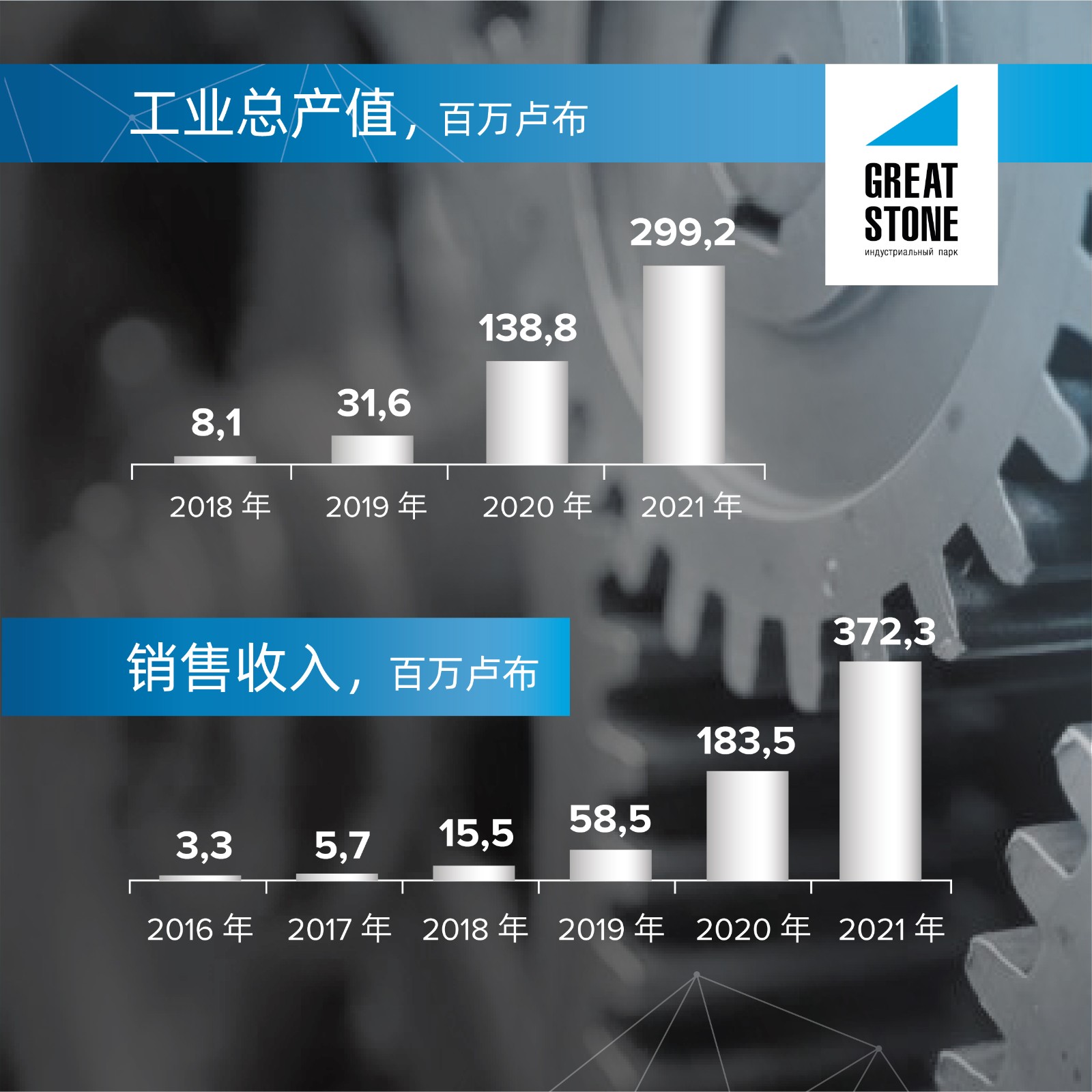 數(shù)據(jù)中,園區(qū)居民企業(yè)的工業(yè)總產(chǎn)值同比去年增長115.5%,達(dá)2.992 億盧布;固定資產(chǎn)投資額較去年同比增長42.2%,達(dá)1.487億盧布;貨物、工程、服務(wù)的銷售收入同比增長102.9%,達(dá) 3.723 億盧布,其中白俄羅斯共和國外銷售收入同比增長達(dá)165.6%。園區(qū)企業(yè)總體凈利潤實(shí)現(xiàn)盈利,達(dá)1390萬盧布; 居民企業(yè)繳納的稅費(fèi)、費(fèi)用等增長60.4%,達(dá)4080 萬盧布。