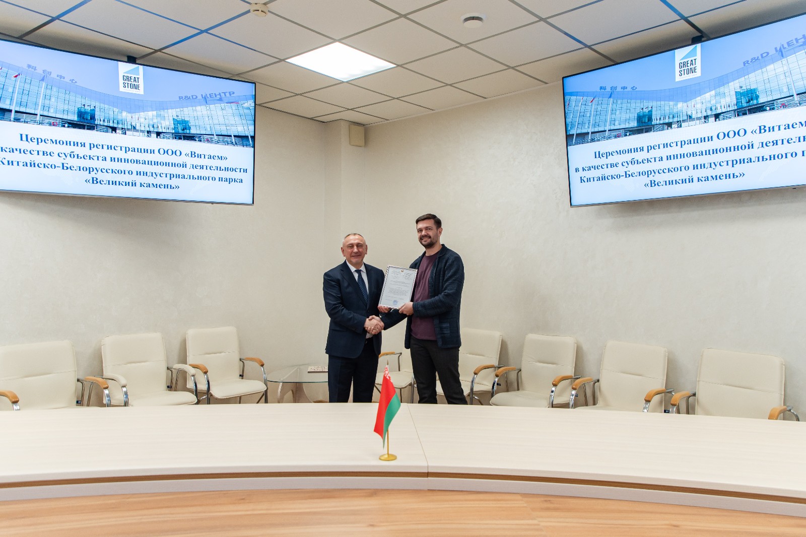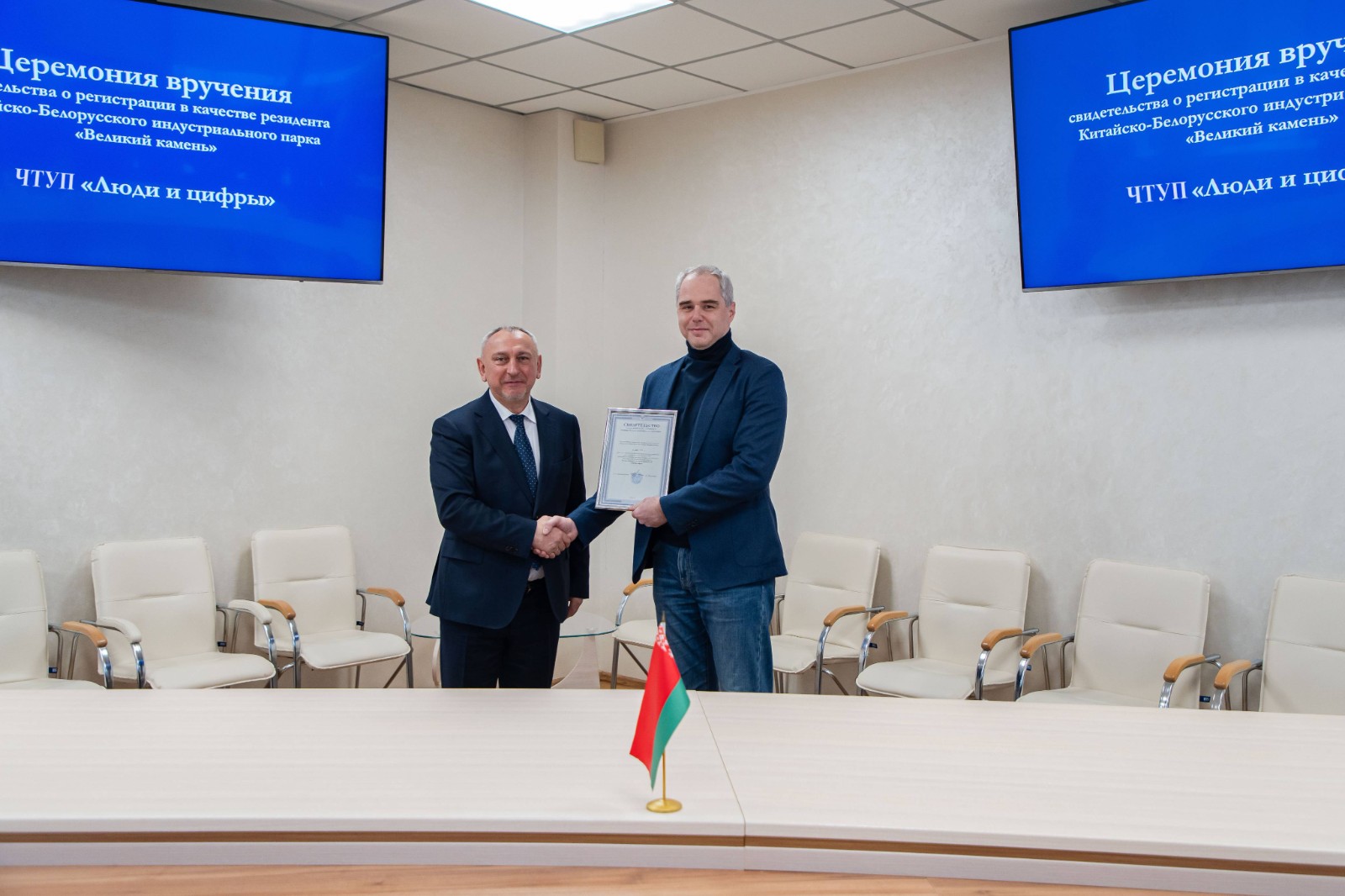 2024 年11 月21 日,居民企業(yè)ЧТУП ?Люди и цифры?和創(chuàng)新活動主體ООО ?Девиар ЭйАй?、ООО ?Витаем?入駐中白工業(yè)園,園區(qū)管委會主任亞羅申科分別向三家公司負責人頒發(fā)居民企業(yè)證書和創(chuàng)新活動主體證書,園區(qū)開發(fā)公司總經理李鐘漢出席本次入園儀式。