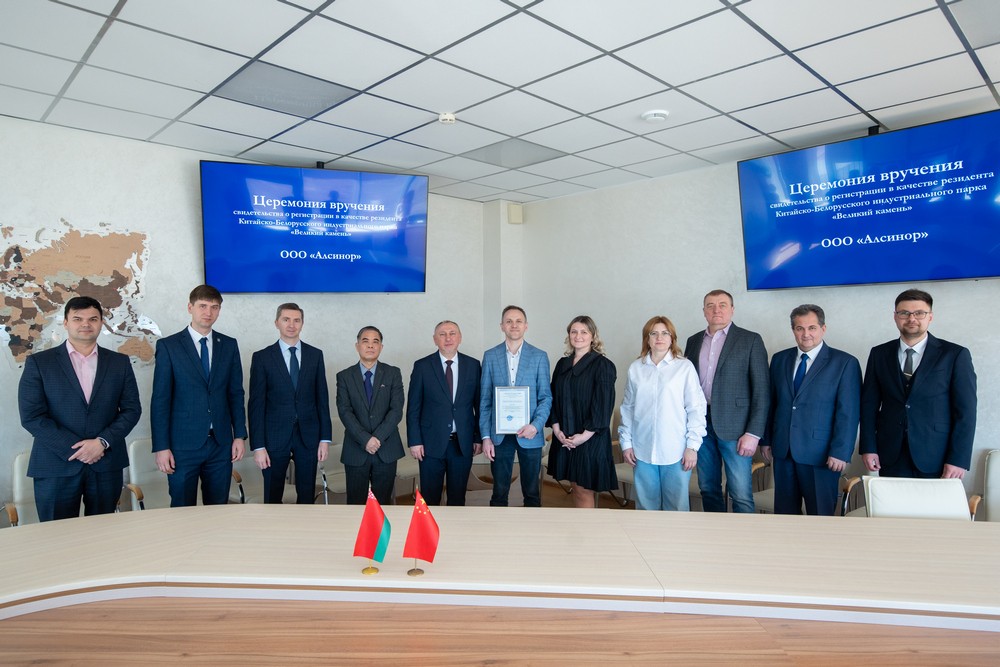 2025 年3月20日, “阿爾西諾爾”有限責(zé)任公司入駐中白工業(yè)園,成為第145家園區(qū)居民企業(yè)。園區(qū)管委會(huì)主任雅羅申科向阿爾西諾爾總經(jīng)理巴爾塔社維奇頒發(fā)居民企業(yè)證書。