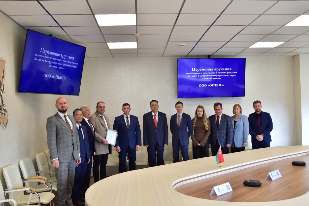 2025 年5月8日,OPENI有限責任公司(白俄羅斯)入駐中白工業(yè)園。園區(qū)管委會第一副主任亞基莫夫向OPENI有限責任公司總經(jīng)理哈拉波夫頒發(fā)居民企業(yè)證書。