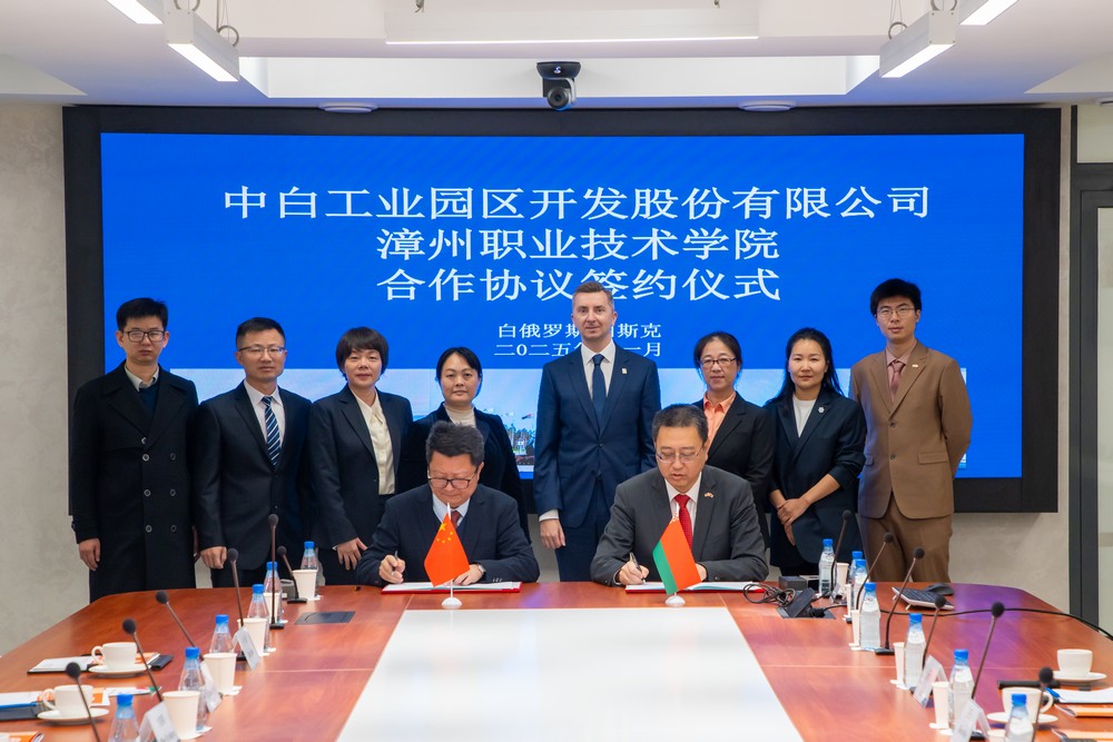 2025年11月25日,中白工業(yè)園區(qū)開發(fā)公司與漳州職業(yè)技術學院在中白工業(yè)園內成功舉行戰(zhàn)略合作框架協(xié)議簽約儀式。漳州職業(yè)技術學院校長何宏舟與中白工業(yè)園區(qū)開發(fā)股份有限公司副總經理任飛代表雙方簽署協(xié)議。開發(fā)公司第一副總經理卡羅杰耶夫等共同出席并見證了簽署活動。