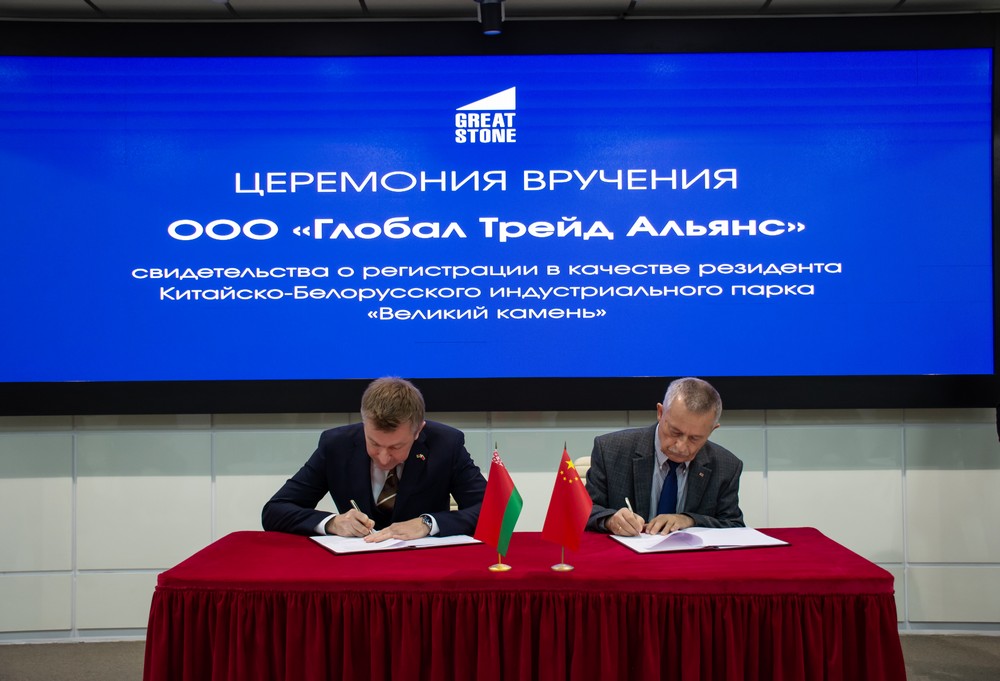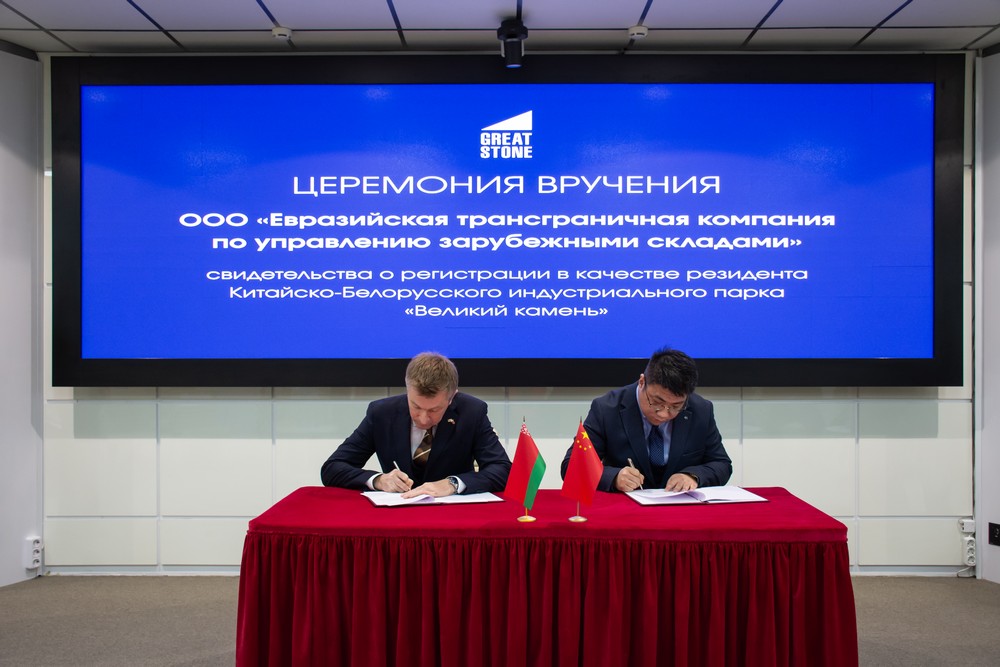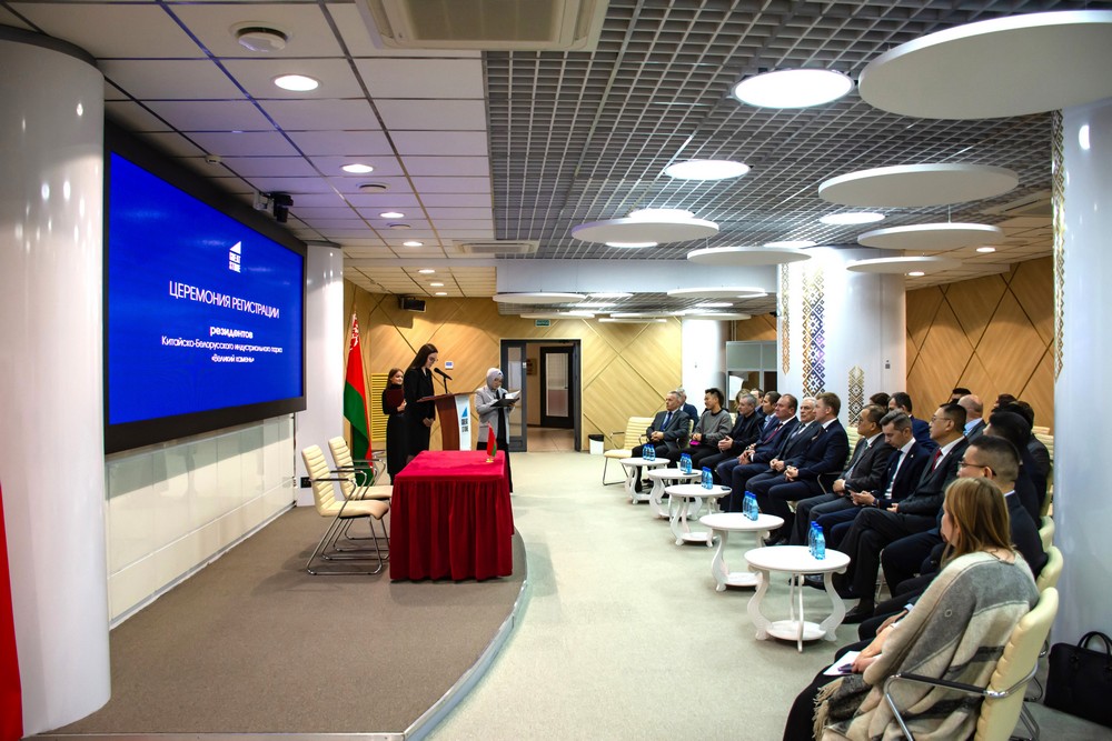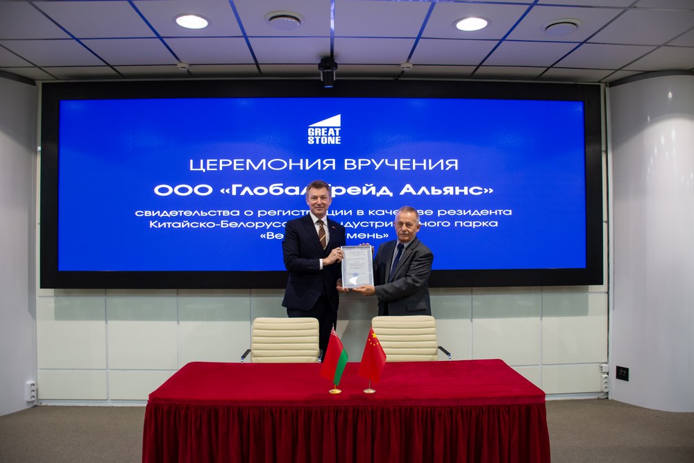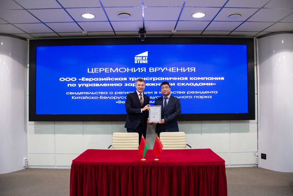 2025年12月5日,中白工業(yè)園隆重舉行居民企業(yè)入園儀式。園區(qū)管委會(huì)第一副主任列別江采夫向環(huán)球貿(mào)易聯(lián)盟有限責(zé)任公司、歐亞跨境海外倉(cāng)管理有限責(zé)任公司的代表正式頒發(fā)居民企業(yè)證書。