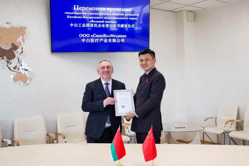 4月12日,中白醫(yī)療產(chǎn)業(yè)有限公司注冊成為園區(qū)居民企業(yè),中白工業(yè)園區(qū)管委會主任亞羅申科向中白醫(yī)療產(chǎn)業(yè)有限公司總經(jīng)理忻尚皓頒發(fā)入園證書,開發(fā)公司總經(jīng)理李鐘漢出席...202304-12