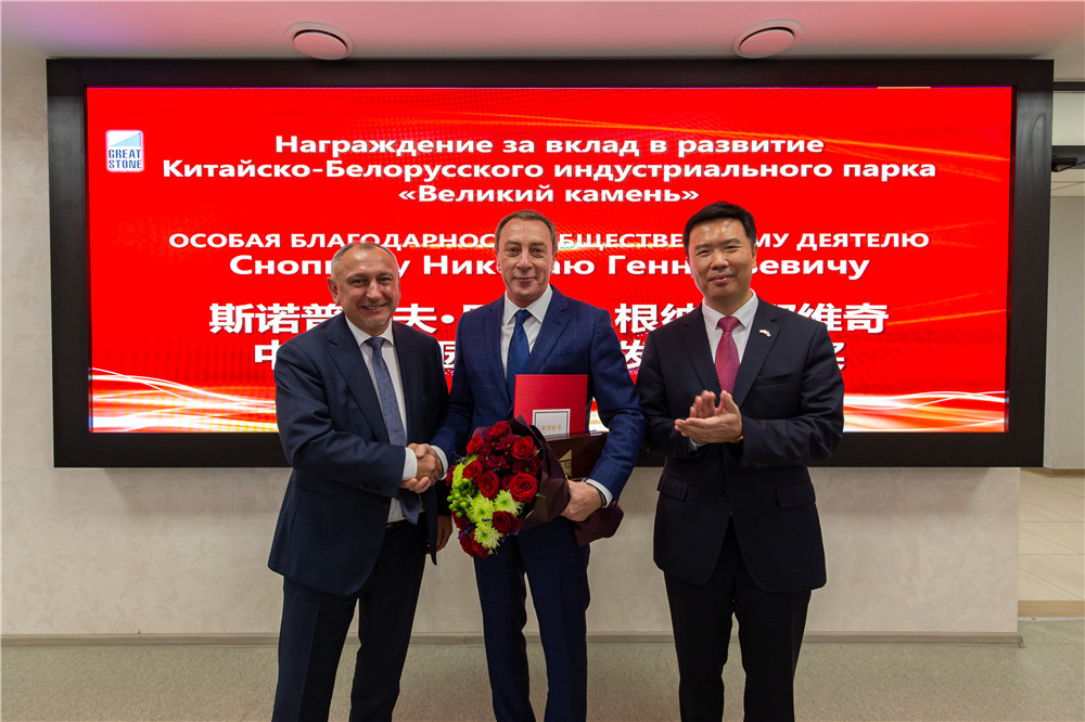 2021年8月27日上午,中白工業(yè)園管委會(huì)主任亞羅申科、園區(qū)開發(fā)公司總經(jīng)理嚴(yán)剛向來(lái)園區(qū)參加董事會(huì)的白俄羅斯第一副總理尼古拉·斯諾普科夫頒發(fā)巨石貢獻(xiàn)勛章和證書,以感...202108-27